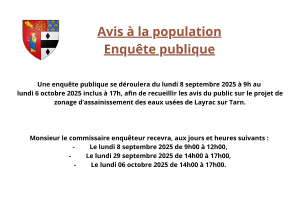 Par arrêté n°A72_2025 en date du 22/07/2025, le Vice-Président de Réseau31 a ordonné l’ouverture de l’enquête publique portant sur la révision du zonage d’assainissement des eaux usées de la commune de Layrac sur Tarn.